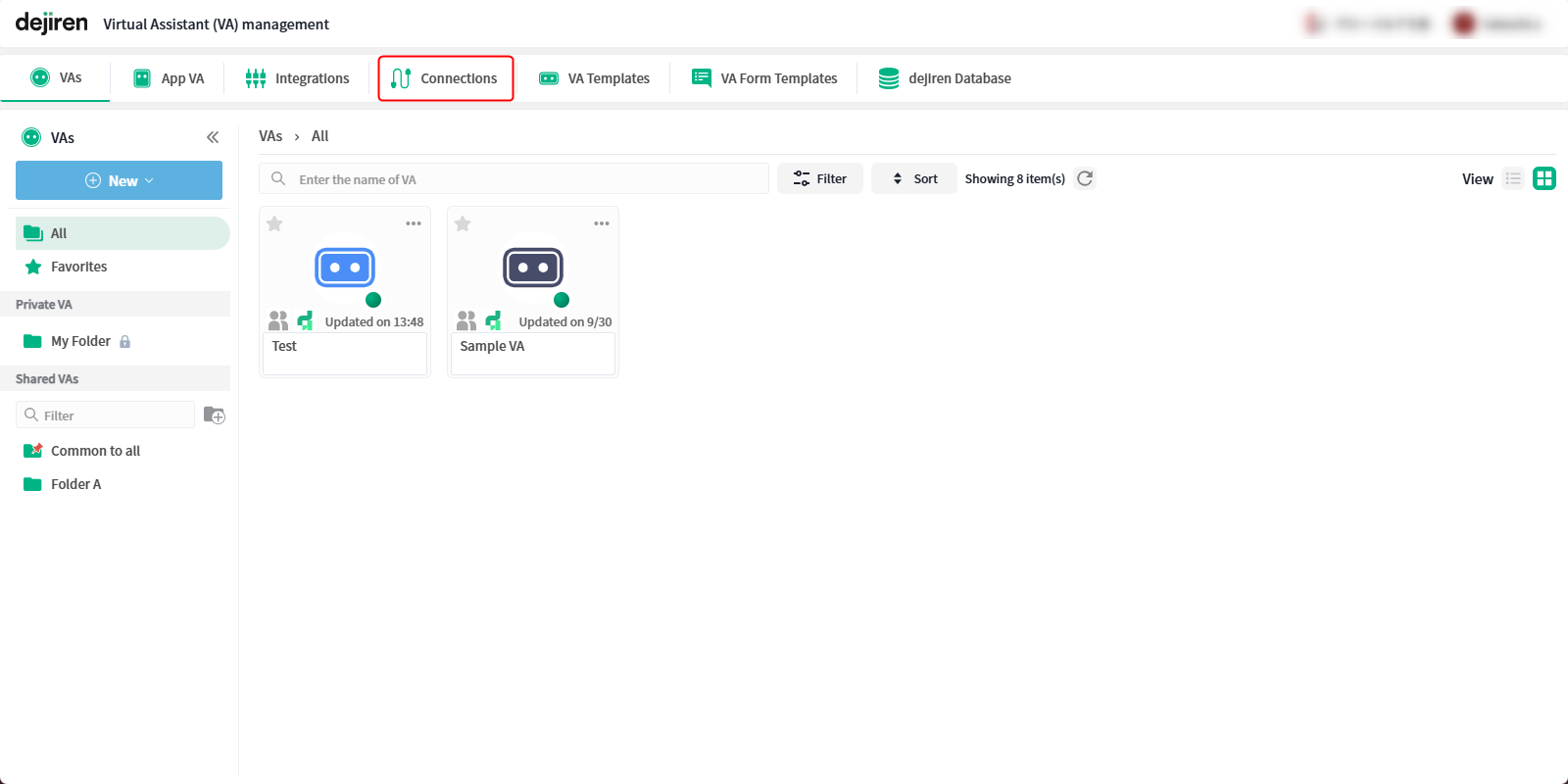 2. On the Virtual Assistant (VA) management page, click Connections from the function selection menu.