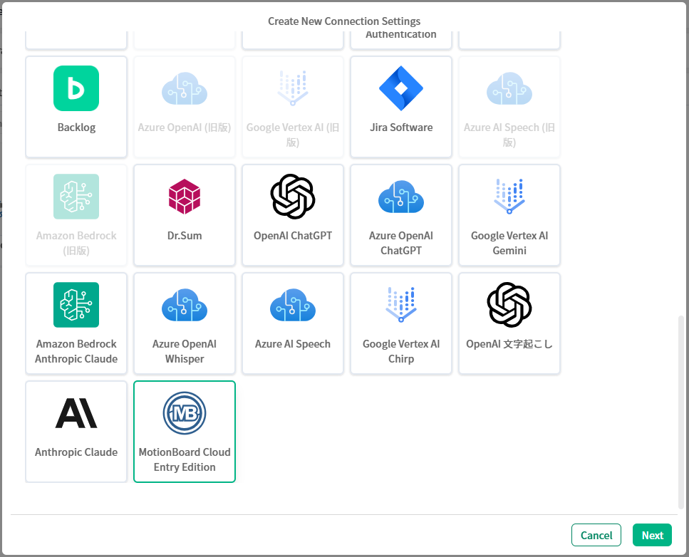 4. In the Create New Connection Settings dialog, Click MotionBoard Cloud Entry Edition and click Next.